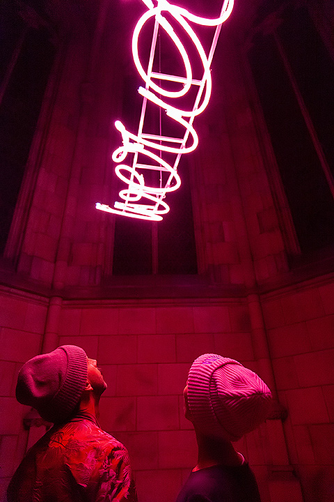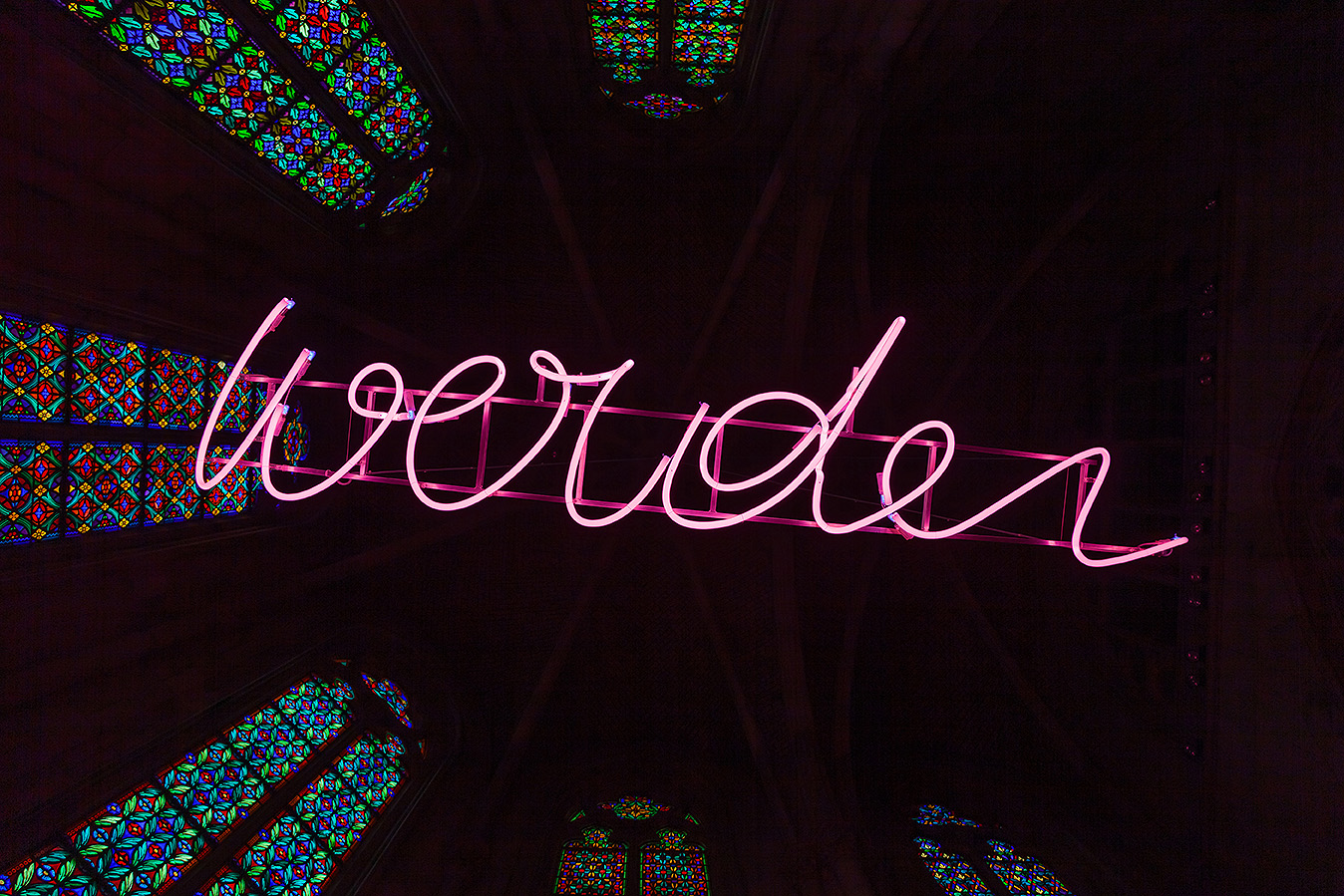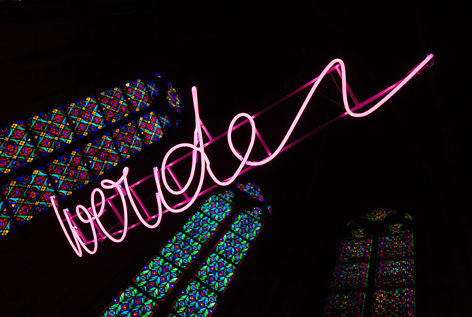 Die Höhen und Tiefen der Serifen der Buchstaben – die Künstlerin hat dafür ihre eigene Handschrift eingesetzt – stehen im Gegensatz zur Strenge und Symmetrie des neugotischen Raums und schaffen zusammen mit dem Neonlicht eine neue Raumerfahrung.
