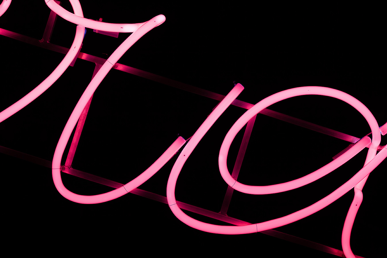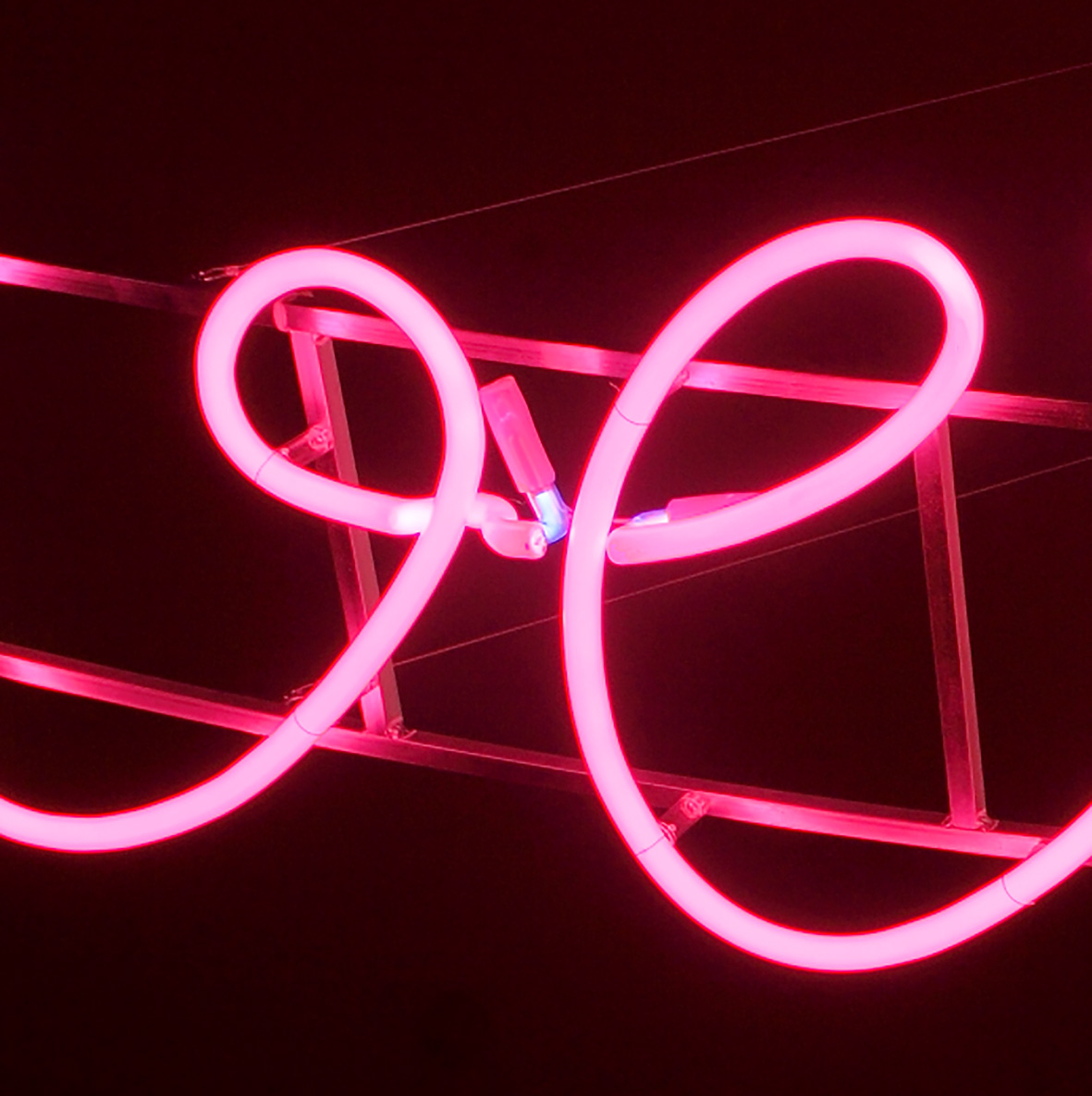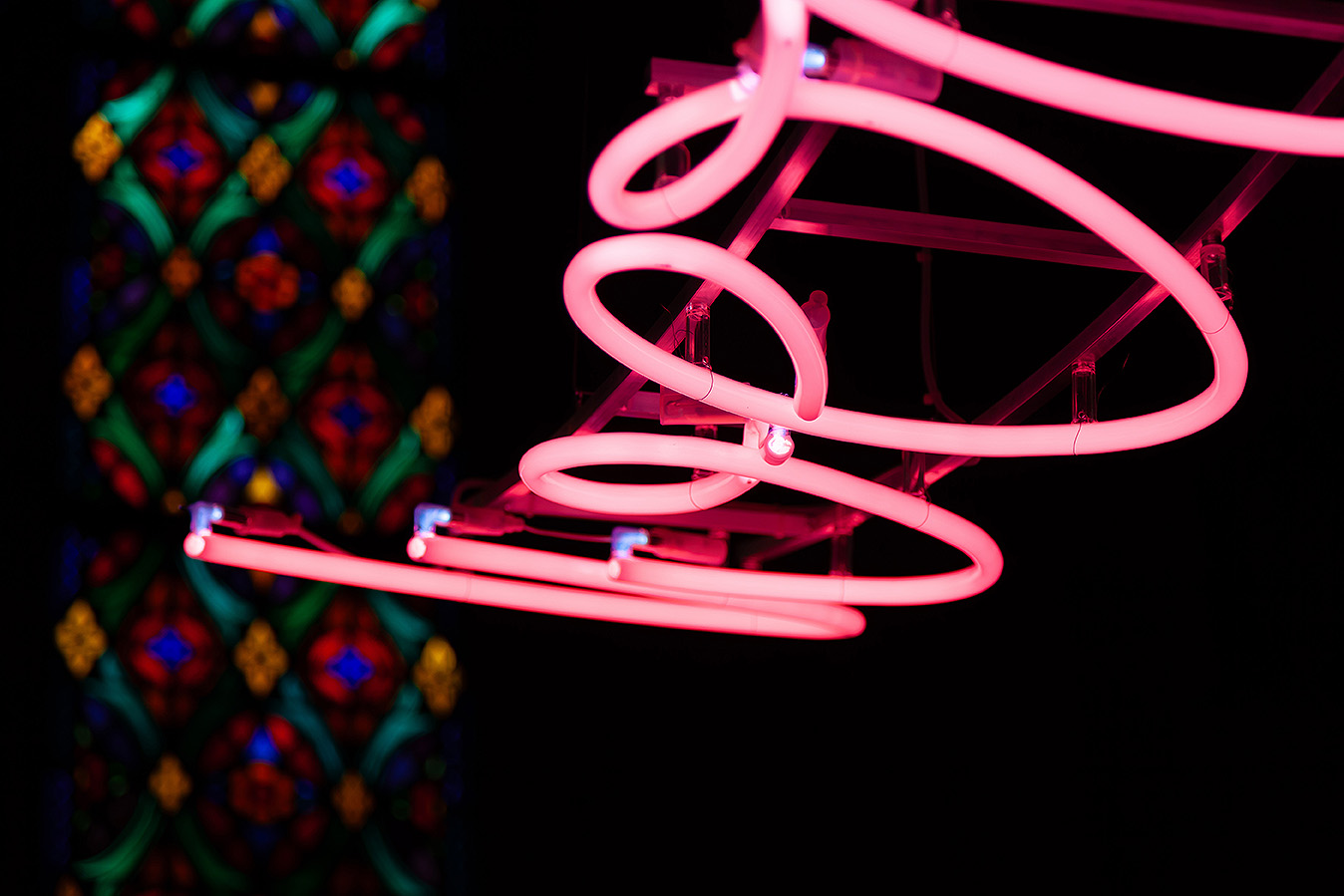 In the tower chapel, a glass script in glowing neon pink hovers 3.5 meters above the ground, immediately drawing the visitor’s gaze. Suspended from the keystone of the vaulted ceiling, the light object bathes the space in saturated color, establishing a striking contemporary focal point within the historical sacred architecture. Its placement invites visitors to move through the space, discovering the work from multiple perspectives.