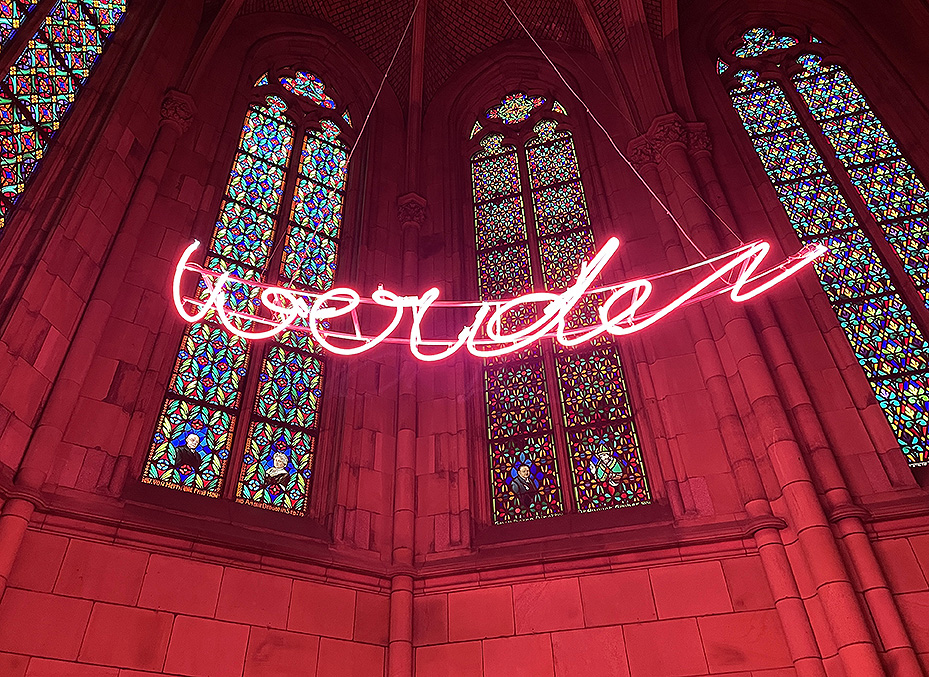 “werden is movement and transformation. As a floating, glowing statement within the sacred space, it challenges rigid patterns and ways of thinking, initiates creative processes, and opens a dialogue between the transcendent and the human.”
